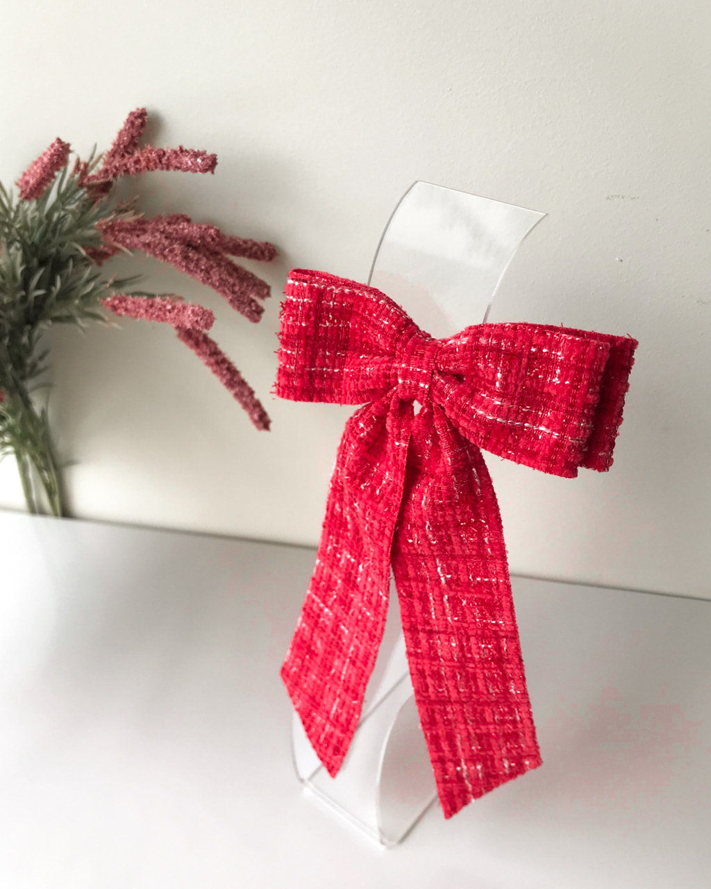 Laço Monique duplo, em fita de tweed vermelho, com presilha bico de pato (6,5 de comprimento).